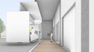 公会堂北防災広場は、災害時は市中心部の避難場所や災害ボランティアの活動拠点とし、平常時は駐車場や賑わい創出の場として活用し、地域住民の交流や憩いの場とすることを目的として整備され、その中で、防災倉庫は災害時に必要な資機材の受渡しや保管場所として計画され、多目的棟は災害時にはボランティアセンタースタッフの会議や休憩場所等として、平常時には公会堂の演者の控室等として利用される計画となっています。